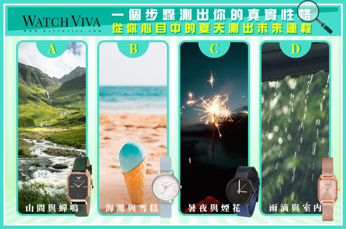 下個禮拜就係大暑啦!講到酷暑,除左每年越嚟越高嘅溫度之外,夏天各種美食、靚衫同精彩嘅暑期活動都正式開鑼啦~大家係咪喺呢個暑期開頭已經開始享受緊今年夏天呢?小編今次為大家帶嚟一個非常適合「夏天」做嘅心理測驗,大家睇到以下場景嘅時候,即刻記低你認爲最符合自己心目中對“夏天”印象嘅選項,嚟睇睇你嘅性格同今年夏天嘅運程,每個選項内仲會有最符合你印象中嘅夏日手錶,快啲繼續睇埋落去開估啦!